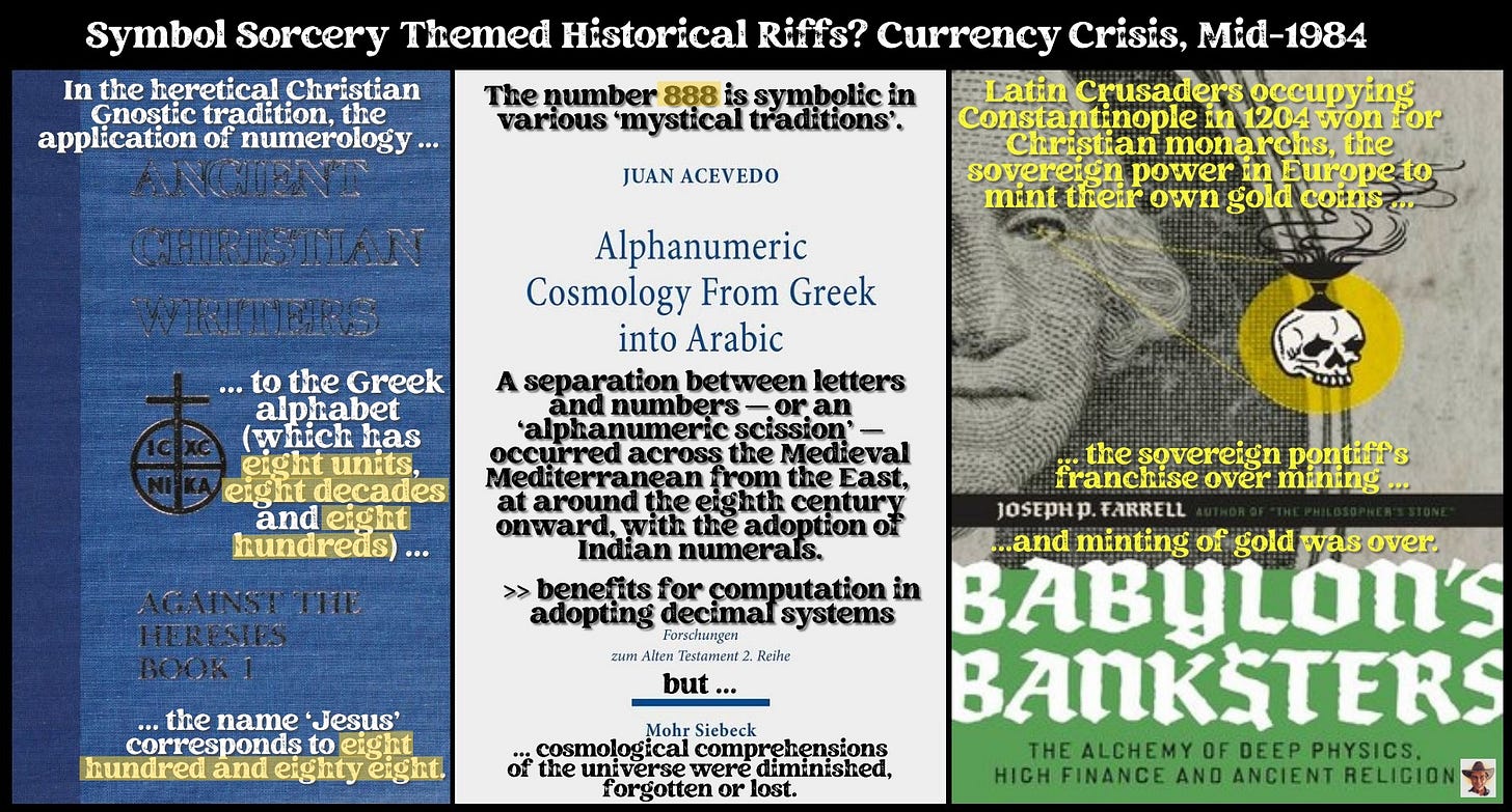 The theater of the changeover of political power in the 1984 election, and it’s entanglement with a currency crisis reveals, in my opinion, a detectable subtext. The themes appear to demonstrate the enduring power of a transmarine banker fraternity planning their chess moves with occult, or hidden, knowledge. And with both, a long range strategy to influence an environment to achieve desired objectives, as well as fleet-of-foot tactics to target opponents, capture allies and bewilder the masses.