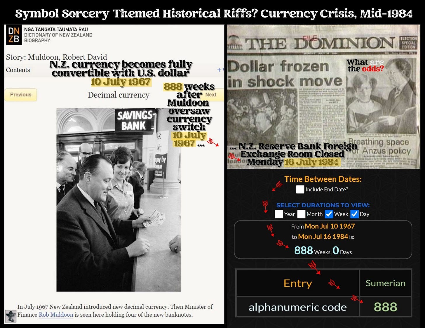 Muldoon’s humiliating capitulation 888 weeks after he led the switch of NZ’s currency from easy convertibility with the imperial U.K. pound to the metric U.S. dollar, was packed with symbol sorcery, and readily decipherable to the metaphor-attuned.