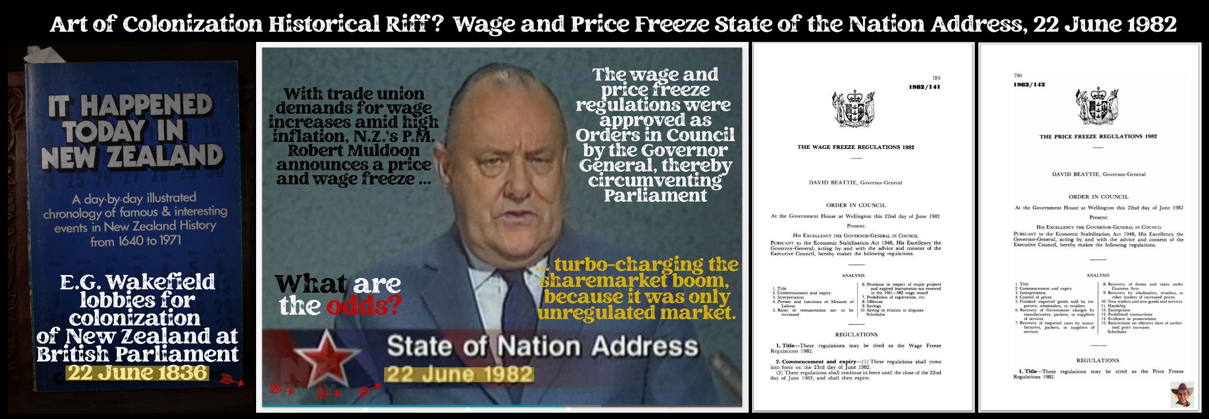 By this route, the Prime Minister circumvented Parliament. In this way, Muldoon’s authoritarian chess move riffed off the New Zealand Company’s move to the Tory with colonists, to New Zealand in May 1839, thereby attempting to beat the British Crown to control land sales and prices. Ergo, Muldoon’s play got the jump on the unions.