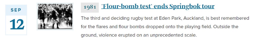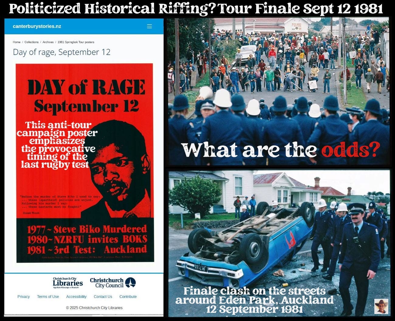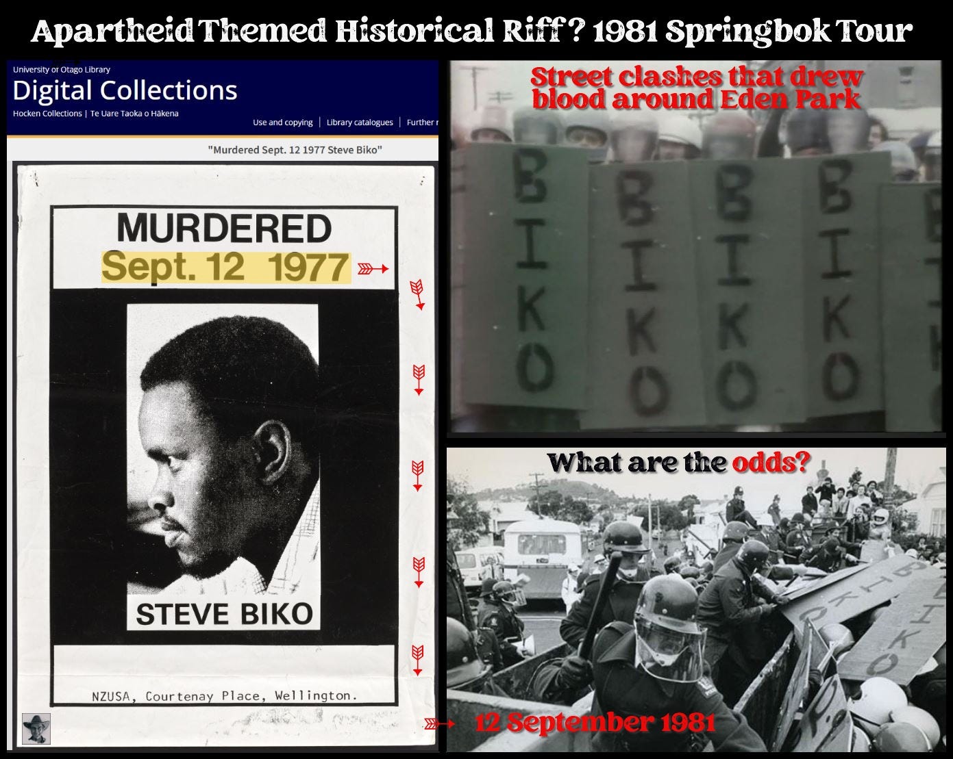 By early spring of 1980, Muldoon’s Government faced a crisis of legitimacy over the epic Erebus cover-up — amid a Royal Commission inquiry, and back-lash about his dominance over a stagnant economy shaken by two Oil Price Shocks. With magical synchronicity, the New Zealand Rugby Union announced the 1981 Springbok Tour on September 12 1980, which coincided with the third anniversary of the death of black rights activist, Steve Biko, at the hands of the Afrikaner Broederbond’s fascist security henchmen. While the Springboks played the All Blacks at Eden Park, the ‘finale’ clash occurred on the streets outside — on September 12th. Muldoon was re-elected in 1981.