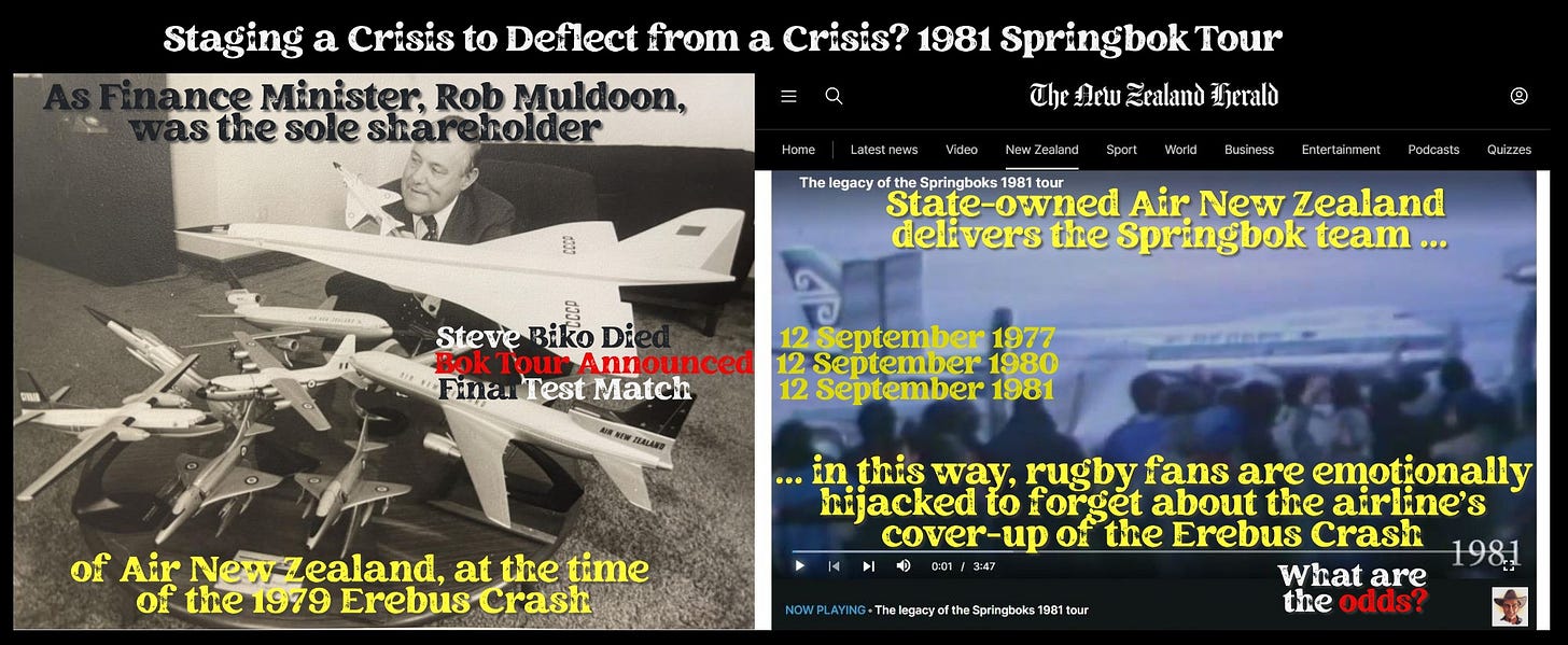 On November 3 1979, Halt All Racist Tours (HART) launched a 500-day campaign to stop a Springbok tour earmarked to occur in New Zealand in 1981. I contend that elements of a transnational deep state network, with an eye for interferring in New Zealand, worked in cahoots with a criminal network operating in N.Z. to stage the ’81 Springbok Tour as a contingency to deal with the aftermath of the planned Erebus Crash. A Labour Government would threaten the ‘necessary’ cover-up, and therefore delivering a compromised National back into power in later 1981 would be optimal.