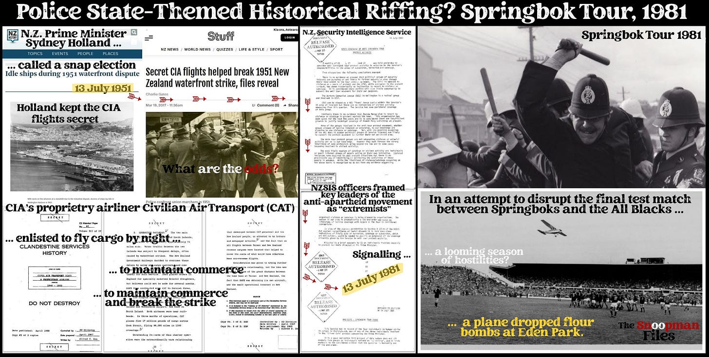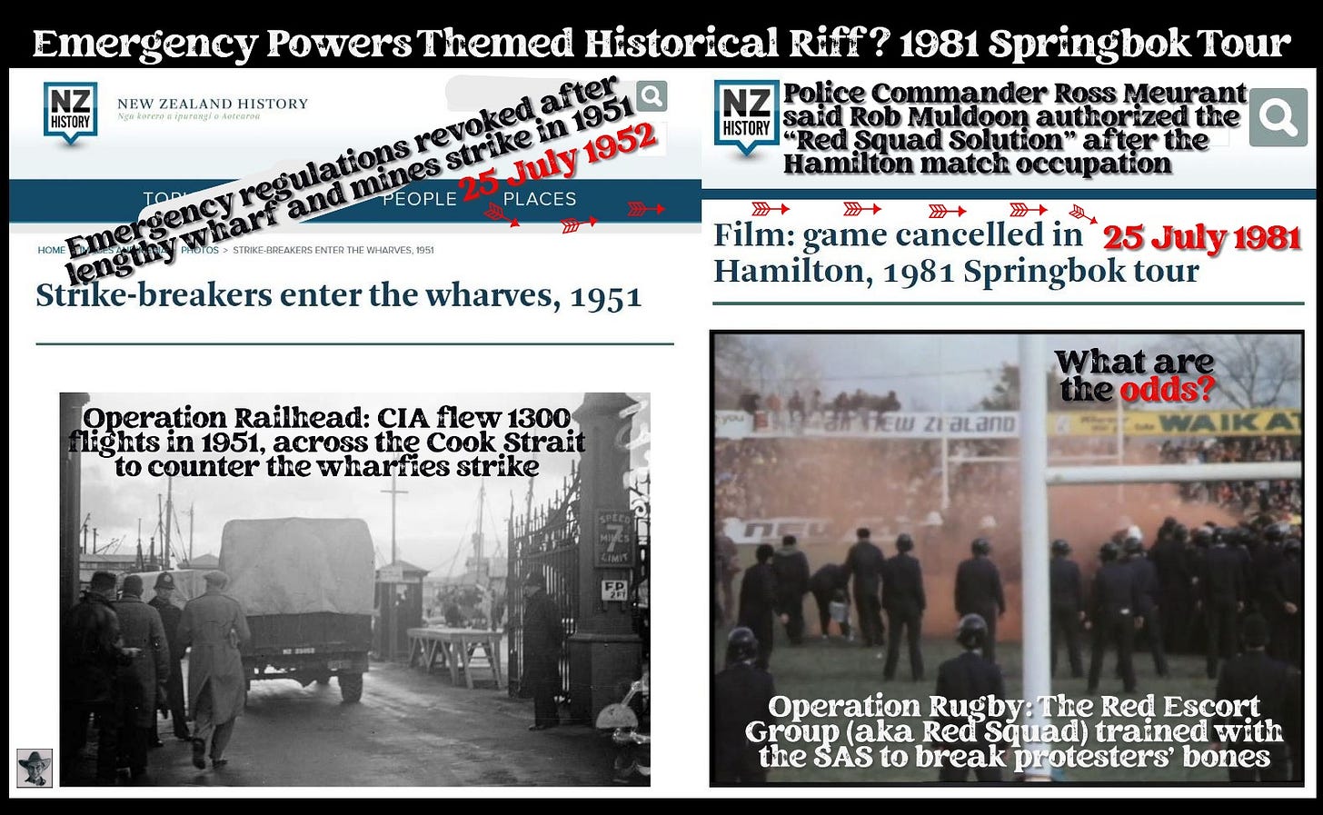 It turns out, Muldoon’s authorization of the “Red Squad Solution” meant that in effect, emergency powers to put down civil disobedience were invoked on the historical date that emergency regulations to overcome the 1951 Watersiders Strike were revoked, on 25 July 1952. It would appear NZ’s deep state were consulting A.W. Reed’s 1971 edition of It Happened Today in New Zealand to riff off history. During the 1951 Waterfront Dispute, the CIA flew 1300 flights across the Cook Strait, under the auspices of Operation Railhead, to keep commerce bouyant, and break the strike.