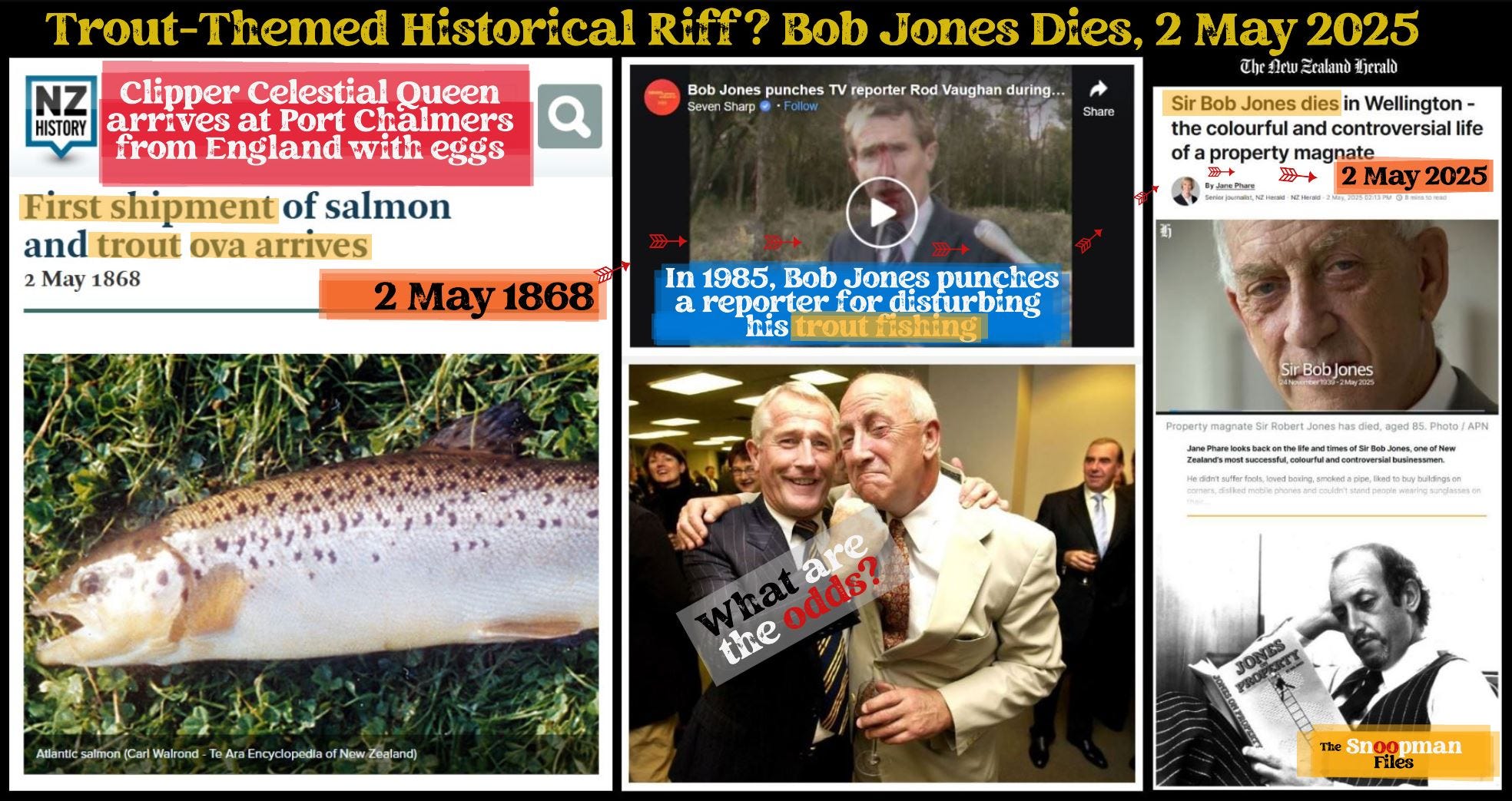 The property tycoon, who was well known for punching a journalist for interrupting his trout fishing, just happened to die on a historical date, May 2 1868, when the first ova for trout and salmon were imported into New Zealand. What are the odds?