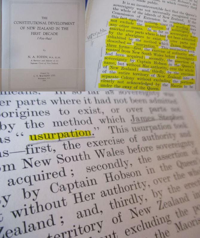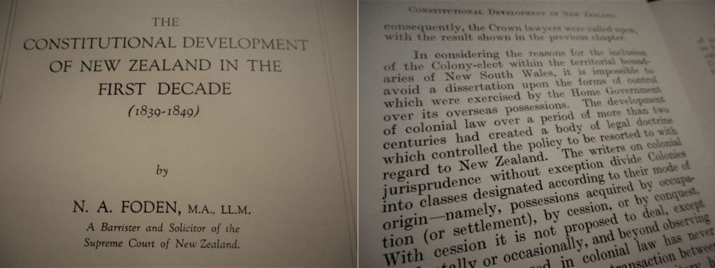 This parallel track was detected by Norman Arthur Foden, whose 1938 work — The Constitutional Development of New Zealand in the First Decade (1839-1849) — proved that New Zealand was acquired by the British Empire on the basis of occupation on June 15th 1839, when the South Pacific archipelago became a dependent colony of New South Wales.