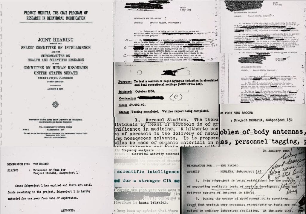 The experiments included sensory torture, deprivation in isolation and re-programming of the mind, experimental psychotropic drugs, allergens and electric shock treatments, as well as mapping the human bio-electric circuitry, behavioral studies with remote control devices, and social conditioning with applied game theory.