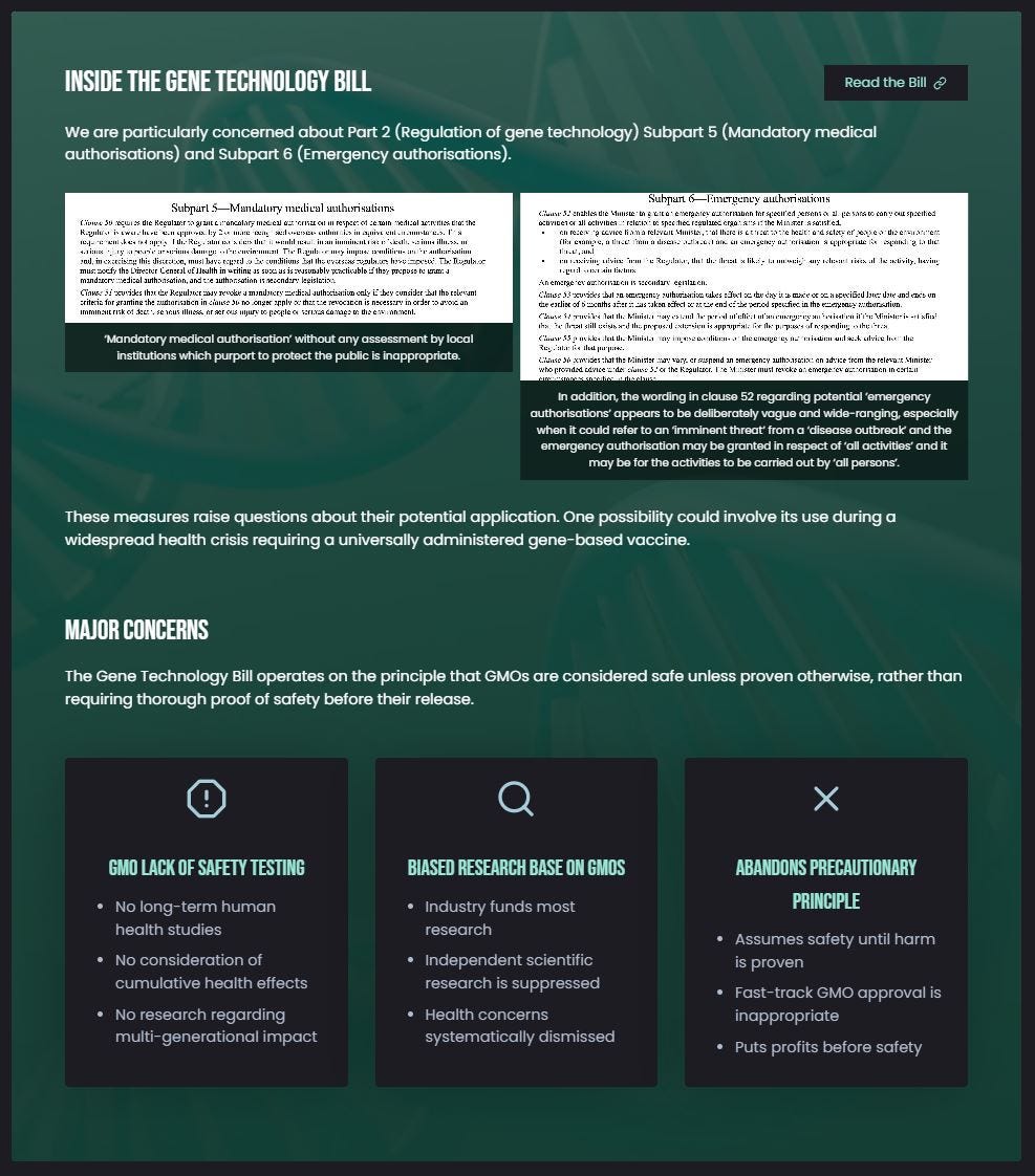Furthermore, the Gene Technology Bill permits “mandatory medical activity authorisations” and “emergency authorisations” that are seen as a biggering of the globalized over-reach of power during the Great Corona Hostage Crisis (2020-2023).