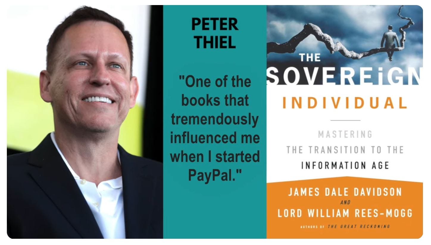 Duran reports that Palantir co-founder Peter Thiel was so captivated by the vision of The Sovereign Individual, he wrote the introduction for the 2020 edition of the book.