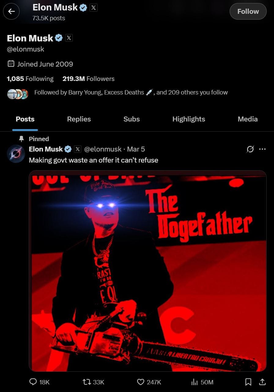 Who better than the Rebel Alliance’s ‘cool billionaire’ to be Apprentice Doge? Musk makes hopium noises with his mouth that are consistent with the aspirations gleaned from the great data analytics harvest off the big-tech dys-social media platforms. He is an expensive steam-valve to release pressure, while fan-boys cheer on the sly charade.