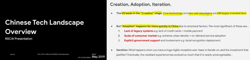 This scenario was presented in May 2019, at the US National Security Commission on Artificial Intelligence, chaired by Eric Schmidt, the former CEO of Google, and then chairman of Alphabet. The National Security Commission on Artificial Intelligence, chaired by Eric Schmidt, presented a “Chinese Tech Landscape Overview” that outlined the need to overhaul the U.S. economy with a hi-tech operating matrix in the near-future, lest America loses its hi-tech edge since China had a faster and larger adoption rate for hi-tech products. Ergo, the pesky peasants need to be sidelined.