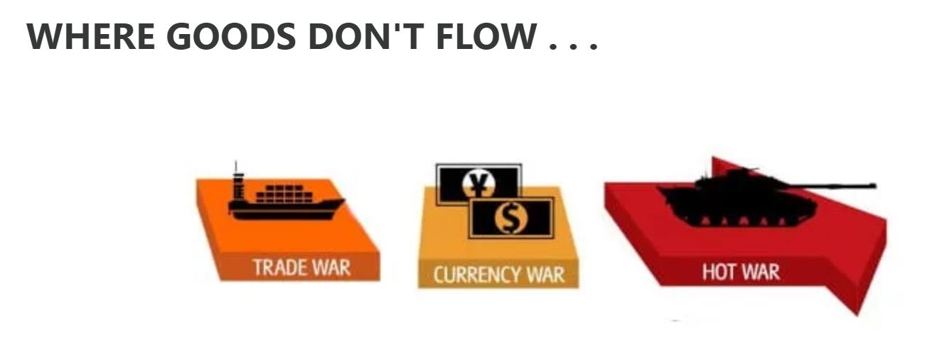 He points out that hot wars start with trade wars that escalate into currency wars.