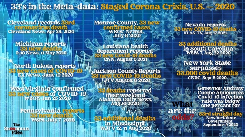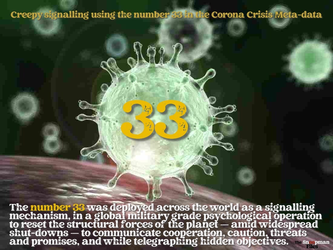 This creepy signalling occurred during the early phases of the so-called ‘pandemic’, by way of federal, state and county officials dropping the number 33 into the corona figures as cases, deaths and crisis meta-data to codify their compliance.