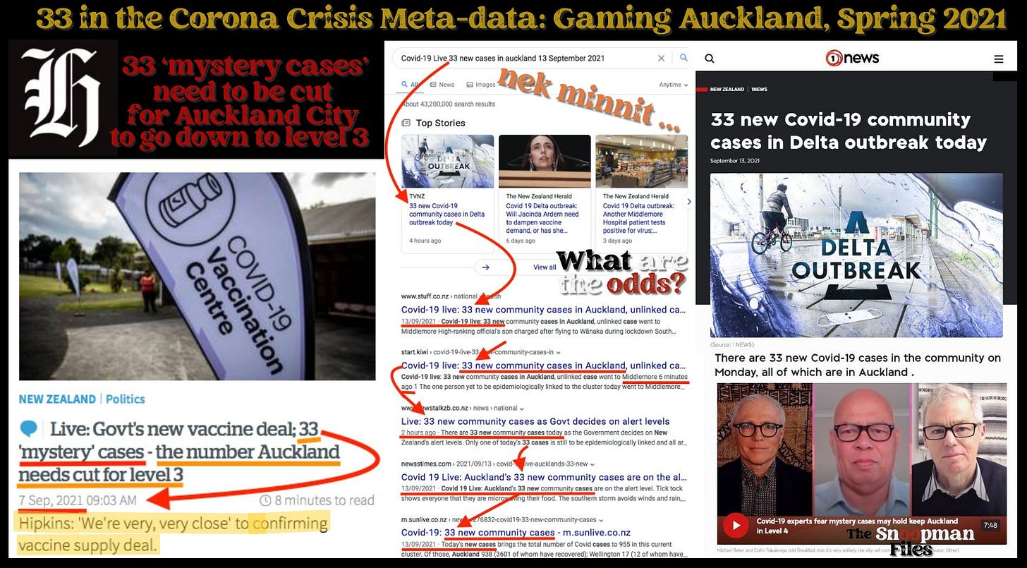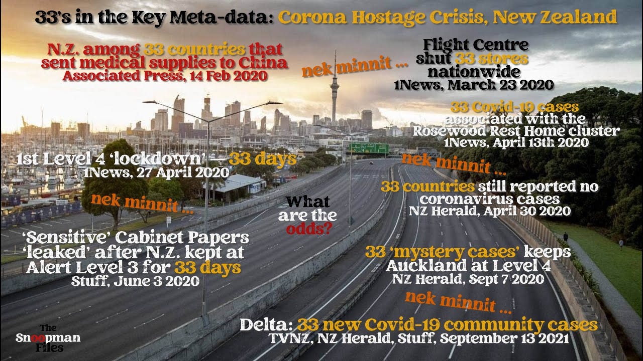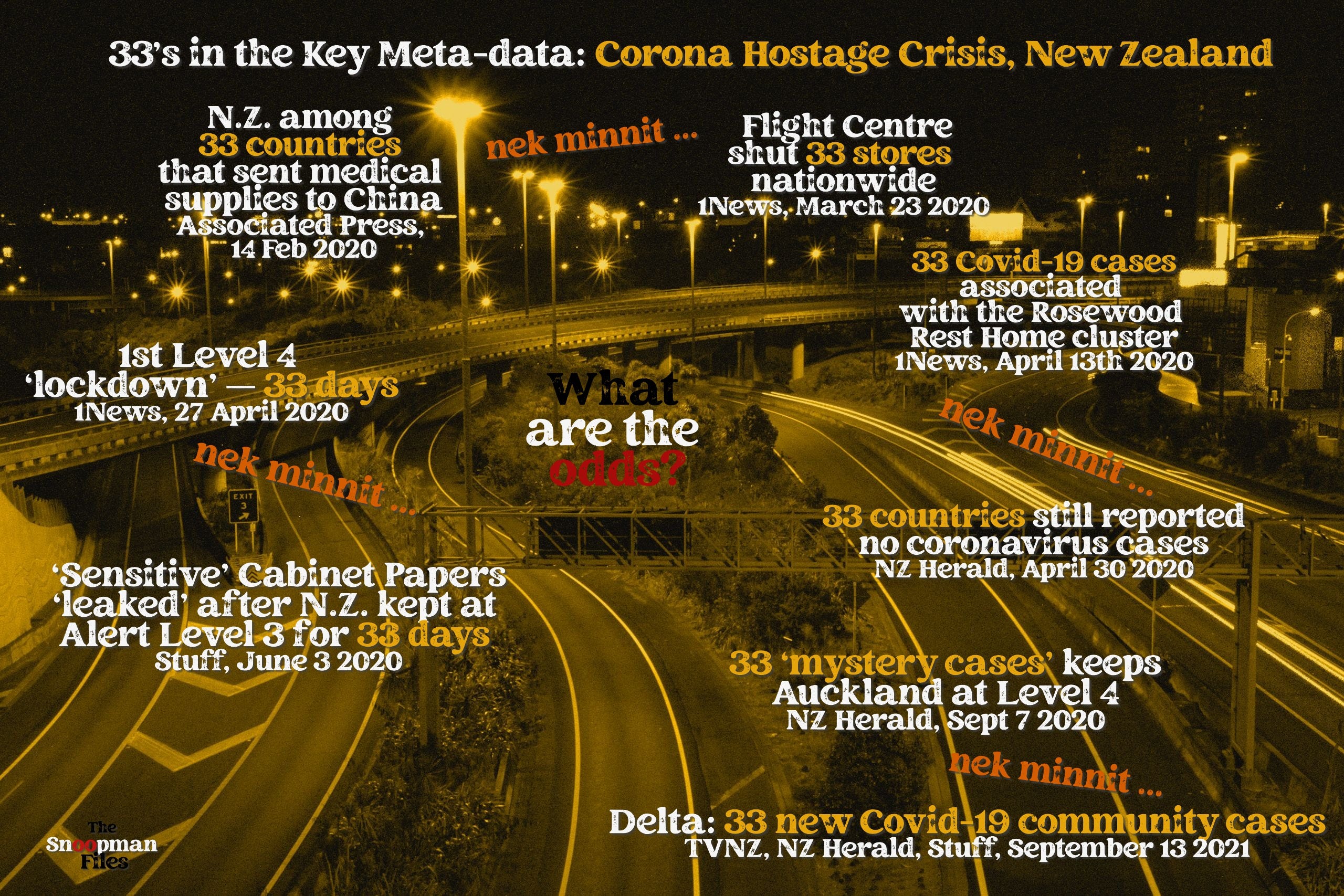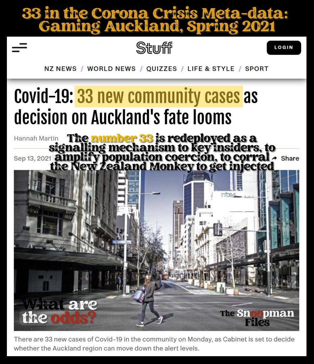Was it merely coincidence that Aucklanders were told via the NZ Herald (Sept. 7 2020) that the exact number of ‘mystery cases’ was 33 and that this number needed to be cut for Auckland City to go down to level 3? And then, six days later on September 13th, the Ministry of Health claimed that there were precisely 33 new Delta cases?