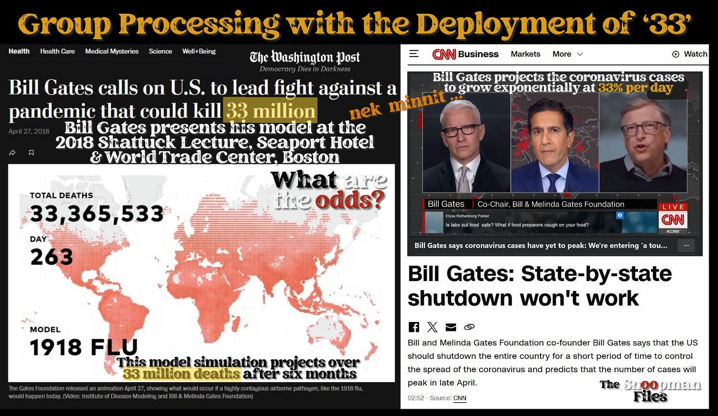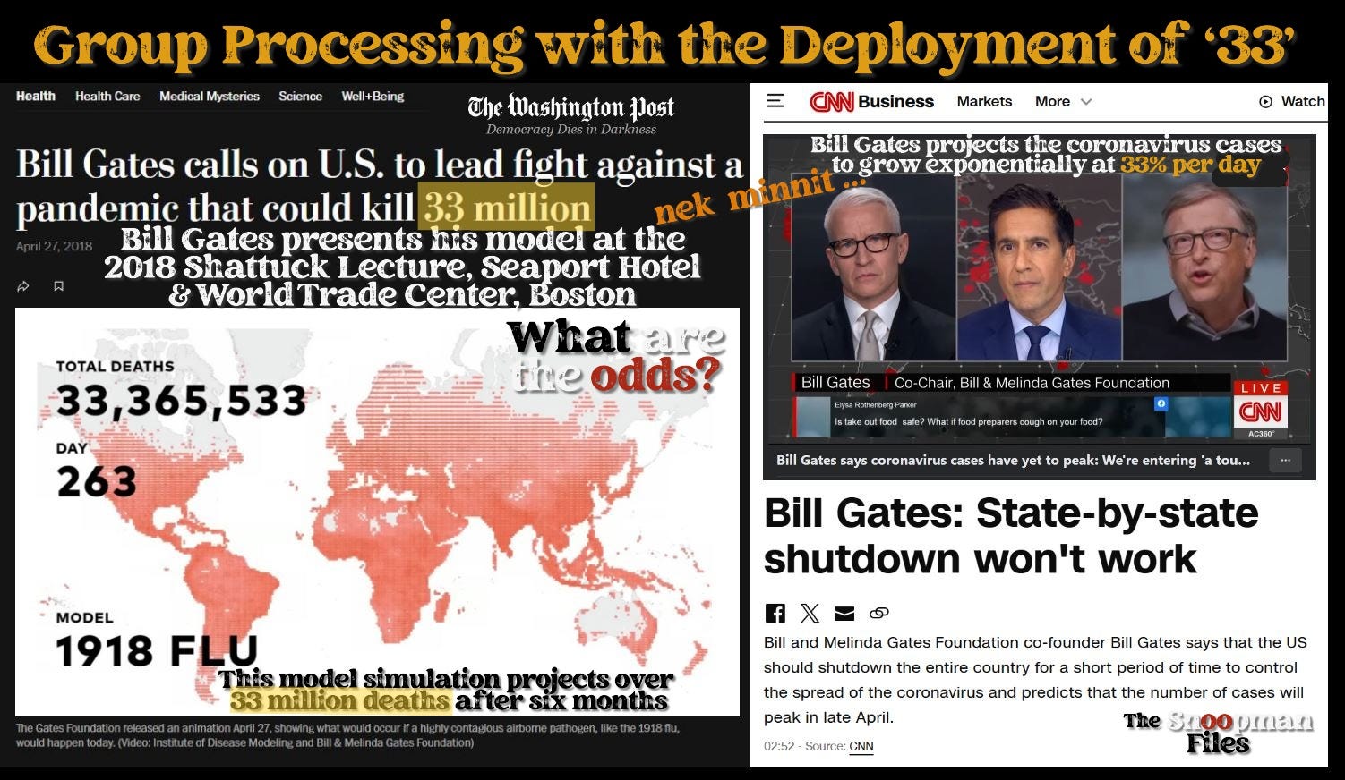 During his 2015 TedTalk, titled, “The Next Outbreak? We’re Not Ready”, the centi-billionaire predatory philanthropist projected this 33 million toll death threat. At this TedTalk, Gates lobbied for ‘germ games’ not more war games, after showing his model projecting 33 million deaths by referencing the 1918 ‘Spanish Flu’ pandemic, which started toward the end of World War I, a conflict that was engineered by a Secret British Elite. And at the widely reported 2018 Shattuck Lecture at the Seaport Hotel & World Trade Center, Boston, Gates also ‘warned’ that in the next pandemic, 33 million people could die worldwide after six months. The group processing continued.