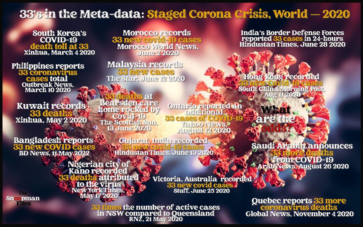 The ‘Corona Plandemic’ was treated as a ‘live exercise’ by the United Nations, including the World Health Organization, and the world’s major and significant states. The meta-data of covid cases, death tolls and key associated events of this ‘corona plandemic’ were encoded with numbers, especially 33, between January 22 and August 30, 2020. Officials deployed the number 33 to signal collusion by chalking up this milestone number.4