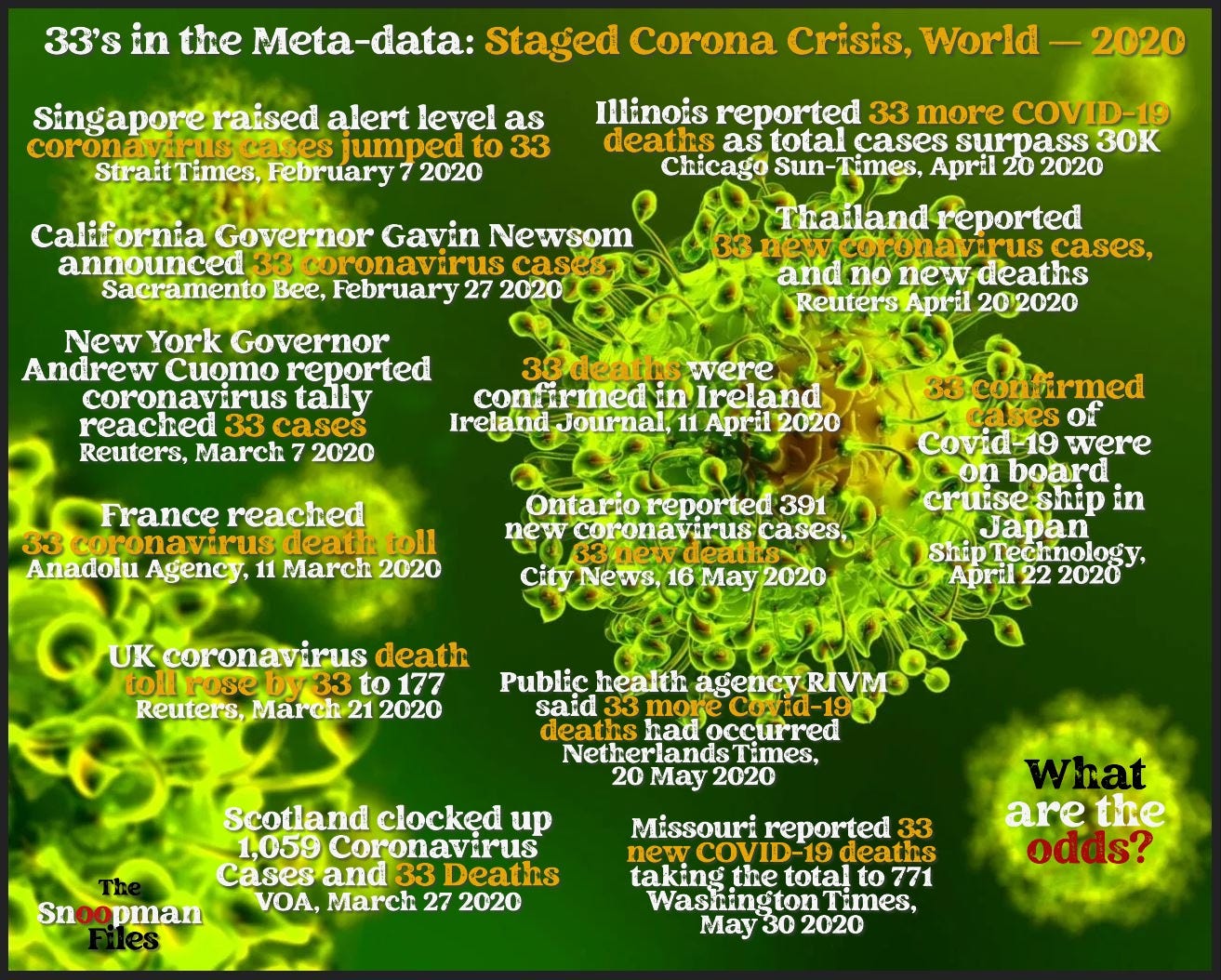 A sample of codified comms follows: On February 7, 2020, the Strait Times reported Singapore raised alert level as coronavirus cases jumped to 33; on February 27, 2020, the Sacramento Bee reported that California Governor Gavin Newsom described 33 coronavirus cases, while the state called the latest coronavirus patient a “turning point”; on March 7, 2020, Reuters reported that Governor Andrew Cuomo said coronavirus cases in New York State increased to 33; Ship Technology (April 22, 2020) reported 33 confirmed cases of Covid-19 were on board cruise ship in Japan; Turkey’s Anadolu Agency reported 11 March 2020, that France’s coronavirus death toll reached 33; Reuters reported March 21 2020, the UK coronavirus death toll rose by 33 to 177; VOA reported March 27 2020 that Scotland clocked up 1,059 coronavirus cases and 33 deaths; Reuters stated April 18, 2020 that Thailand reported 33 new coronavirus cases, and no new deaths; on April 20, 2020, the Chicago Sun-Times stated that Illinois reported 33 more COVID-19 deaths as total cases surpassed 30K; the Ireland Journal reported 11 April 2020 that 33 deaths were confirmed in Ireland; and on 16 May 2020, a City News headline said “Ontario reported 391 new coronavirus cases, 33 new deaths”; Netherlands Times reported 20 May 2020 that the public health agency RIVM said 33 more Covid-19 deaths had occurred; and the Washington Times headlined on May 30 2020, that Missouri reported 33 new COVID-19 deaths taking the total to 771.