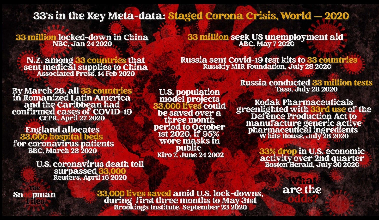 The ‘Great Corona Hostage Crisis’ was treated as a ‘live exercise’ by the United Nations, including the World Health Organization, and the world’s major and significant states. The meta-data of Covid cases, death tolls and key associated events of the Covid-19 Plandemic were encoded with numbers, especially 33, particularly between January 22 and 30 August 30, 2020. [The U.N.’s Global Preparedeness Monitoring Board issued a directive on September 18 2019, for at least two pandemic exercises to occur by September 2020, with at least one exercise featuring the deliberate release of a respiratory pathogen. [See: “A World at Risk”]. Officials deployed the number 33 to signal collusion in the U.N.’s Corona World Games by chalking up this milestone number — as weird as it sounds. The Covid meta-data points to a blueprint designed by a supranational deep state network, or synarchy. This centralized supreme group inflicted the ‘Covid PlanPanic Health Emergency’ as a covert form of bio-terrorism to reset the world with a bio-security system.